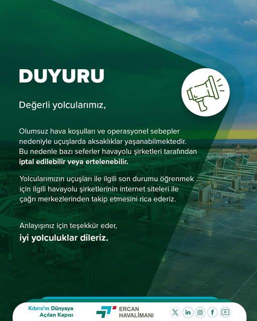 Ercan havayolları müdürlüğünün iptallerle ilgili duyurusu şöyle.