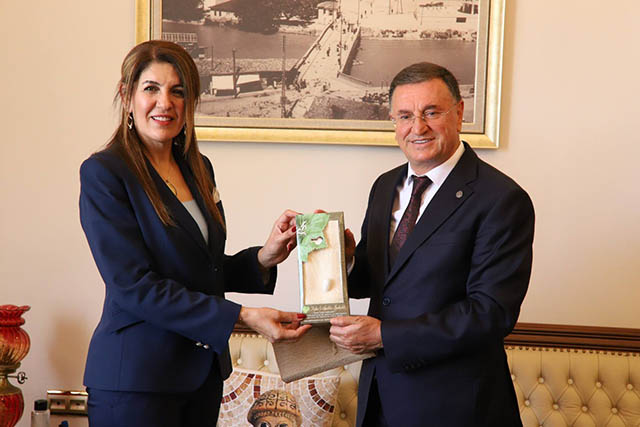 Kuzey Kıbrıs Türk Cumhuriyeti (KKTC) Mersin Başkonsolosu Zalihe Mendeli, Hatay Büyükşehir Belediye Başkanı Doç. Dr. Lütfü Savaş’ı makamında ziyaret etti. Hatay’daki ziyaretlerinde kendini hiçbir zaman yabancı gibi hissetmediğini belirten Mendeli, “Hatay, bizim için apayrıdır. Birçok Hataylı vatandaşımız ülkemizde yaşıyor. Artık Hataylılar ile iç içe yaşıyoruz ve ayrılmaz bir bütün olduk. Ülkemizle ilgili sosyal, kültürel ve ekonomi gibi alanlardaki projelerin hayata geçirilmesi için somut adımların atılması lazım. Tabi ki sizlerin bu konuda çok önemli adımlarınız var. EXPO 2021’de bizler de yer alacağız” dedi.