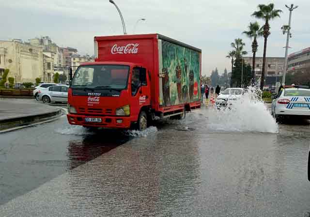 Antakya’nın merkezi yerinde, köprü başında, su borusu patladı, sürücüler zor anlar yaşadı