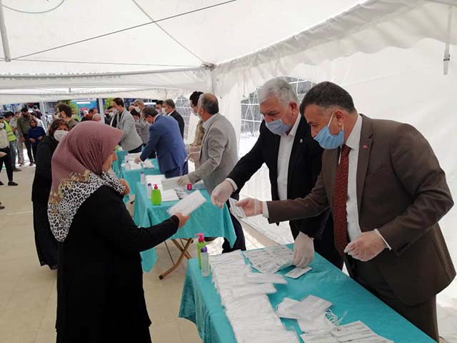 AK Parti Hatay Milletvekili Hüseyin Şanverdi, CHP Hatay Milletvekili İsmet Tokdemir, Kaymakam Ali Candan, Belediye Başkanı Mehmet Hacıoğlu ile Meclis üyeleri yanı sıra Emniyet Müdürü Hayri Şahin ve İlçe Jandarma Komutanı Binbaşı Abbas Çelik, Reyhanlı Belediye binası önünde kurulan stantta vatandaşlara maske dağıttı. Protokol, daha sonra, Yeni Mahalle’de kurulan semt pazarına geçerek burada da esnaf ve vatandaşlara maske verdi.