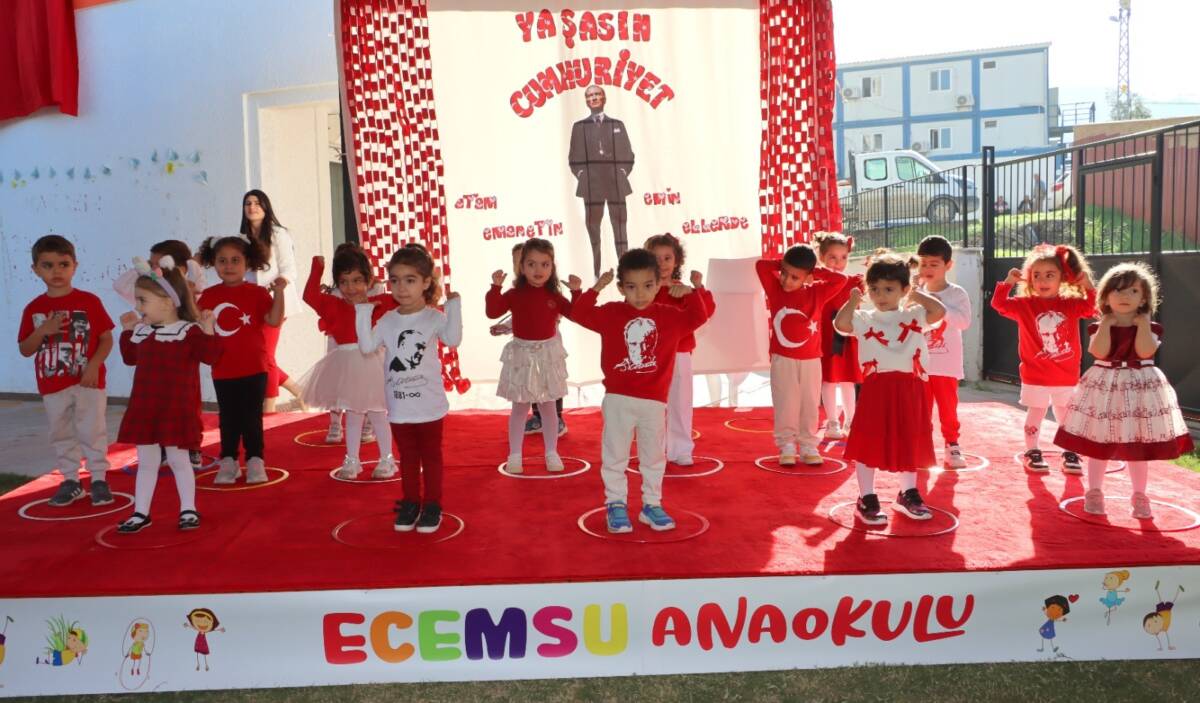 Ecemsu Anaokulu’nda gerçekleştirilen kutlamalar, Cumhuriyet’in geleceği olan minik yüreklerin sahnedeki özgüveni ve heyecanıyla unutulmaz bir gün olarak hafızalarda yer etti.