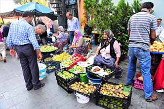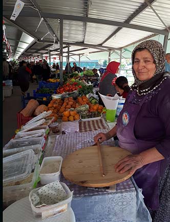 Tezgâhlarda; sebze, meyve, turşular, reçeller, lezzetli ev yemekleri var: İçli köfte, çiğ köfte, mercimekli köfte, sarımsaklı köfte, dolma ve sarma çeşitleri de… Piknik tüplerin üzerine saclar yerleştirilmiş; sıkma, börek, gözleme, katmer yapılıyor. Bir köşedeki semaverden sıcak çayınızı da alıp içebiliyorsunuz. Bir tezgâhtan otlu börek alıyoruz. İçinde her çeşit ot var… Isırgan otu, dereotu, ıspanak, maydanoz, … Kahvaltımızı yapmıştık, ama bu da ara öğün sayılabilir. Ne zaman gitsem, kendimi burada mutlu hissederim.