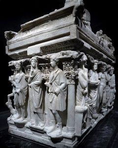 işlenmiştir. Lahdin yapıldığı dönemde, eğer kişi vasiyet ettiyse, lahit kapağında bir heykelle tasvir ediliyorlardı. Kapaktaki eroslar, çiftin huzurlu bir evlilik yaşamış olduklarının işareti sayılmaktadır.