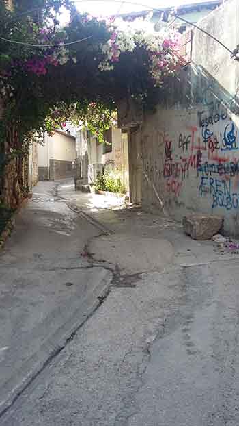 GAP Turları ile Mardin, Gaziantep, Şanlıurfa gibi kentlerin rotası üzerinden Antakya’da da mola veren çok sayıda tur otobüsünden inen kalabalıkların eski kente giriş noktasındayız. Zemin ve yapısal sorunların biriktiği bir kısımda, kocaman demir çerçeveli aydınlatma lambalarının verdiği mesajı anlamaya çalışıyoruz!