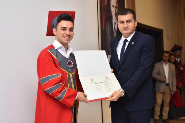 Mehmet Hakan Satun, mezuniyet kütüğüne plaka çakarken oldukça heyecanlandı. Sertifikaların dağıtımının ardından dereceye giren mezunlara diplomaları ve İTSO (İskenderun Ticaret ve Sanayi Odası) ve Atakaş Şirketler Grubu sponsorluğunda, hediyeleri takdim edildi. -Cemil Yıldız-