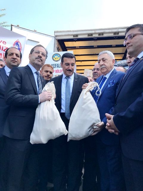 Bakan ve beraberindeki kalabalık esnaf heyeti, Afrin’e gönderilmek üzere hazırlanan yardım paketlerinin yüklendiği tırların uğurlama törenine de katılım gösterdi. -Tamer Yazar-
