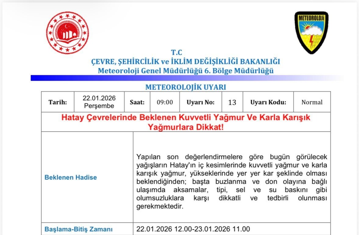 Meteoroloji Genel Müdürlüğü 6. Bölge Müdürlüğü, Hatay çevreleri için kuvvetli yağış uyarısında bulundu. Yapılan son değerlendirmelere göre, bugün Hatay’ın iç kesimlerinde kuvvetli yağmur ve karla karışık yağmur, yüksek kesimlerinde ise yer yer kar yağışı bekleniyor.
