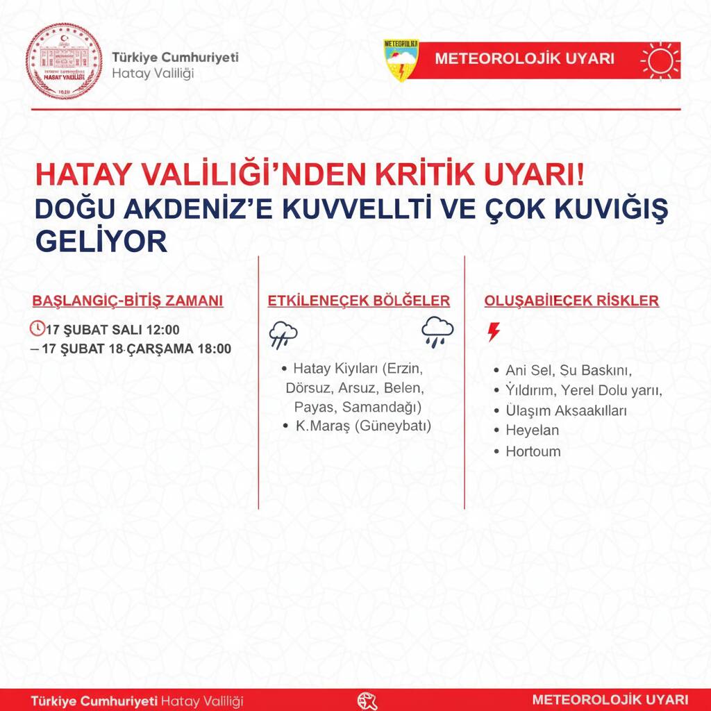 18 Şubat Çarşamba: Sabah saatlerinden itibaren Hatay kıyıları (Erzin, Dörtyol, Arsuz, Belen, İskenderun, Payas, Defne, Samandağ, Yayladağı) kuvvetli yağışın etkisi altına girecek.