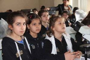 Öğrenciler, Üniversite Öğretim Üyesi Doç. Dr. Burçin Özer’in eşliğinde, laboratuvarlarda mikroskop yardımıyla çeşitli türdeki mikropları incelediler. Fen Bilimleri derslerinde gördükleri mikroskobik canlıları