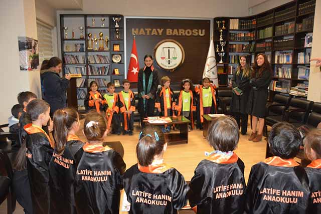 Antakya’da bir anaokulu öğrencisi grup, önceki gün Antakya Adliyesi’ne gitti ve Hatay Barosu’nun konuğu oldu. Yaşları 4-5 olan miniklere Avukatlık Cübbesi giydirildi. Hatay Barosu Çocuk Hakları Komisyonu etkinliği olarak, 20 Kasım Dünya Çocuk Hakları Günü kapsamında ağırlanan Latife Hanım Anaokulu öğrencilerini; Baro Başkanı Av. Ekrem Dönmez, Genel Sekreter Av. Asena Aslan Şener, Hatay Barosu Çocuk Hakları Komisyonu üyeleri karşıladı. Hakları ile ilgili eğitim almış olan çocuklar, hazırladıkları pankartlarla, minik cübbeleri ve sohbetleri ile etkinliğe renk katarken, günü de anlamlı kıldı.