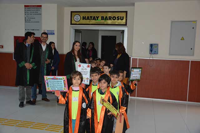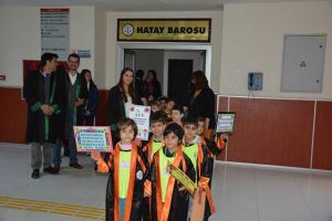 Antakya Adliyesi’nde görenlerin, “Maşallah ne güzel çocuklar” dediği etkinlik kapsamında, öncelikle çocuklar ve öğretmenleri ile tanışma oyunu oynandı. Ziyaret kapsamında, çocuk hakları ve hazırlanan pankartlar üzerine konuşulurken, Adliye ve Baro miniklere tanıtıldı, çocukların sordukları ilginç ve düşündürücü sorular cevaplandı. Bu arada “Haklar Şarkısı” da çocuklarla birlikte söylendi. Bu arada çocukların minik elleri ile tuttukları hak pankartları ve küçük cübbeleri, izleyenlere ve görenlere, masumiyeti yeniden hatırlattı