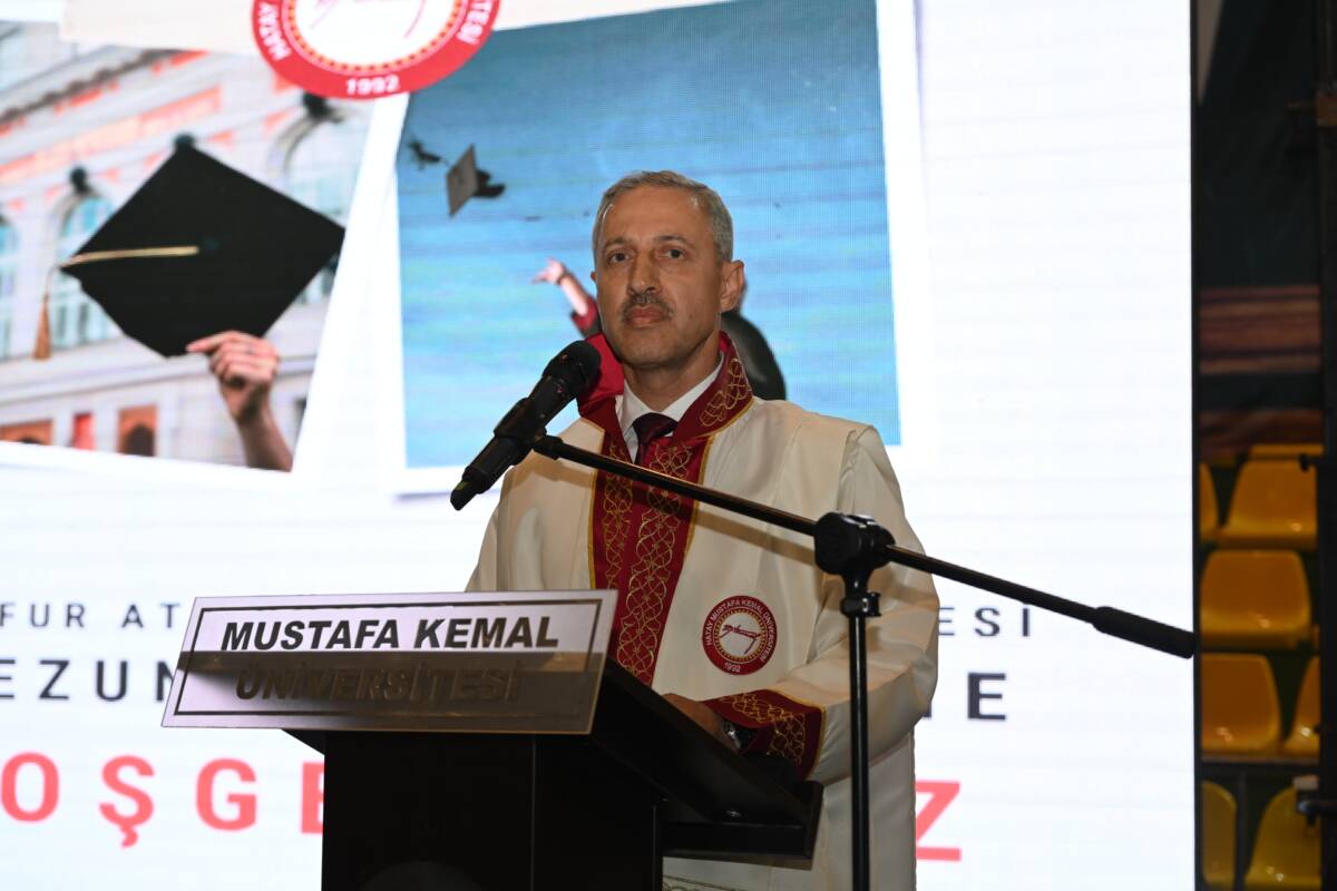 Fakültenin Dekanı Prof. Dr. Cahit Özer ise 13. mezuniyet töreninin her yıl yeniden yaşanan heyecanı yansıttığını belirtti. Zorlu afetler ve süreçlere rağmen öğrencilerin eğitimlerini başarıyla tamamladığını vurguladı. Ayrıca, MKÜ’nün öğrenci odaklı anlayışla eğitim, hizmet ve araştırma kalitesini artırmak için büyük çaba harcadığını ifade etti.