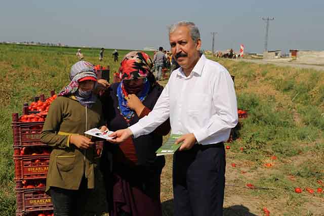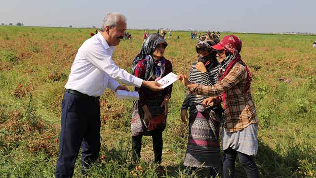 İl Milli Eğitim Müdürü Kemal Karahan’ı, gittiği domates, muz ve pamuk tarlalarındaki tarım işçileri çok iyi karşıladı ve hediyeye teşekkür etti. -Selvi Günay-