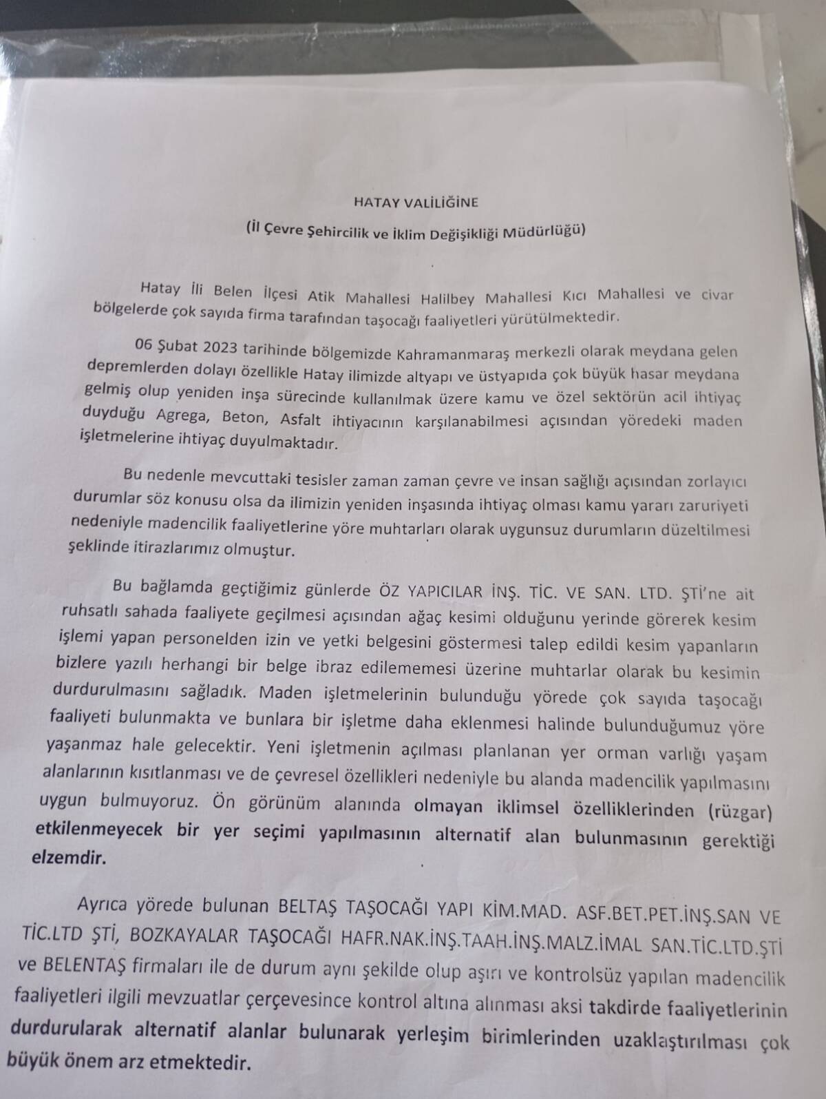 Hatay’ın Belen ilçesinde beş mahalle muhtarı, bölgedeki taş ocaklarının kontrolsüz faaliyetlerine karşı ortak bir açıklama yaparak yetkililere çağrıda bulundu. Atik, Halilbey, Cumhuriyet, Kıcı ve Çakallı mahallelerini temsil eden muhtarlar, bölge halkının sesine kulak verilmesini istedi.