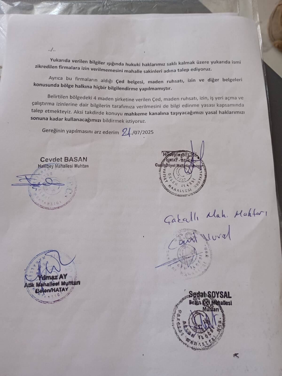 Yetkililere seslenen muhtarlar, Hatay Valisi Mustafa Masatlı başta olmak üzere tüm milletvekilleri ve siyasi temsilcilerden konuyla ilgilenmelerini istedi. “Bölge halkının taleplerine kulak verilmezse, konuyu yargıya taşıyacağımızı kamuoyuna duyuruyoruz. Hukuki haklarımız saklıdır” diyerek açıklamalarını sonlandırdılar.