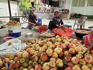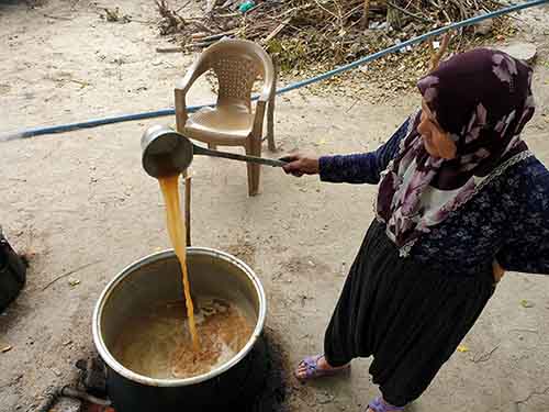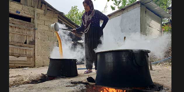 Bu keyifli, ama bir o kadar da yorgun telaşın içindeki isimlerden, Fatma Türkmenoğlu, salata ve çorbalarda kullandıkları nar ekşisinin şifa deposu olduğunu dile getirirken, “Dalından toplanan narları dilimlere ayırarak, leğenlerde tanelerini kabuğundan ayırıyoruz. Daha sonra çuvallara katıp, tepelemek suretiyle suyunu çıkarıp bakır kazanlarda odun ateşi üzerine kaynatıyoruz. Bu şekilde ekşi oluyor” diye konuştu.