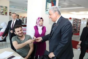Plaket töreninin ardından, İskenderun Teknik Üniversitesi (İSTE) Rektörü Prof. Dr. Türkay Dereli ve Hayırsever İşadamı Nuri Üysen, sınav haftası yoğunluğunda Kütüphane’de derslerine çalışan öğrencilere kuru üzüm dağıttı ve sınavlarında başarı diledi. -Tamer Yazar-