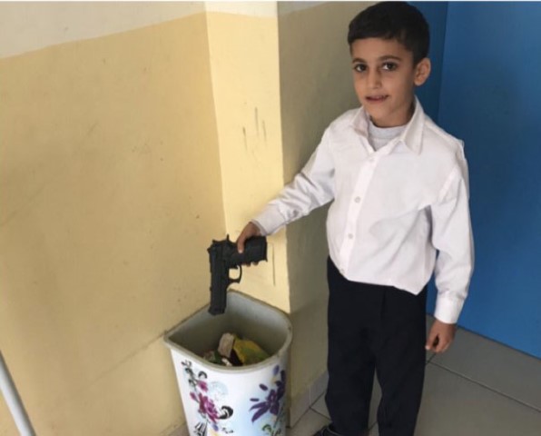Hatay Fenerbahçe İlkokulu Sınıf Öğretmeni Özgür Cihan Tahiroğlu, okul genelinde, örnek teşkil edecek; “Oyuncak Silahını At, Hediyeni Al” Projesini başlattı.