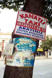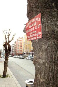 Boş bulabildiğimiz her karış toprağı yerel idareciler eliyle ‘çiçeklendirme’ telaşına giren bizler, şehrin merkezindeki ağaçların bedenlerine ‘çivilediğimiz’ taksi tabelaları ile nasıl bir mesaj veriyoruz?