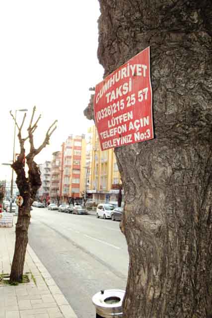 Merak edilen kısım, ağaçlara çakılı haldeki bu taksi bilgilendirme levhalarından bazılarının okunamayacak derecede eski ve hatta paslanmış olmaları, ama buna rağmen yerlerinden kaldırılmamaları ve hatta yenilenmemeleri… Bu durum, resmi ‘ilgisizliğimizin’ boyutuna da ayrı bir ‘sorgu’ noktası katmalı mı?