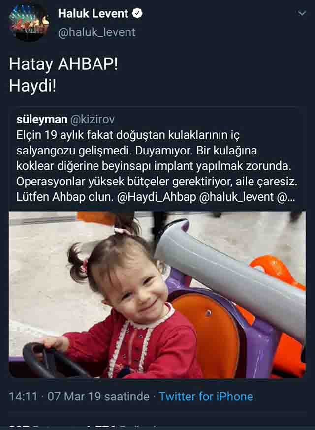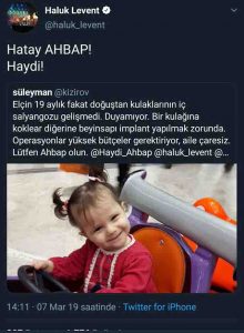 Haberimiz 5 Mart’ta yayınlandı ve çok kısa bir süre içerisinde de ses buldu. Henüz 19 aylık Elçin Bebek için hayati önemdeki ‘iç kulak ameliyatının’ bir an önce yapılabilmesi için harekete geçenler ise, Sanatçı Haluk Levent önderliğinde ilerleyen Ahbap Platformu oldu.