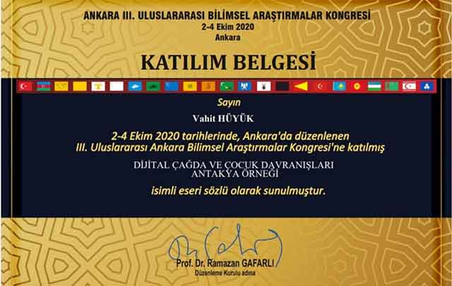 “Okulumuz öğretmenlerinden Vahit Hüyük, 3. Uluslararası Bilimsel Araştırmalar Kongresi’nde ‘Dijital Çağda Çocuk Davranışları’ konulu bildirisini online olarak sunmuştur. Hocamıza teşekkür eder, iyi çalışmalar dileriz.”