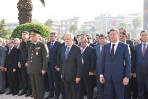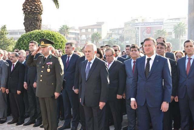 Türkiye Cumhuriyeti’nin kurucusu Ulu Önder Atatürk’ü anma törenine; Hatay Valisi Erdal Ata, 2’nci Hudut Alay Komutanı Piyade Albay Ahmet Gürbüz, Hatay Büyükşehir Belediye Başkanı Doç. Dr. Lütfü Savaş, Hatay Cumhuriyet Başsavcısı Ahmet Tekne, MKÜ Rektörü Prof. Dr. Hasan Kaya, Hatay Barosu Başkanı Av. Ekrem Dönmez, Vali Yardımcıları Orhan Mardinli, Aydın Tetikoğlu, Erol Özkan, Nursal Çakıroğlu, Bilal Ölmez, Mahmut Hersanlıoğlu, Meral Batı Demirbaş, İlçe Kaymakamları, İl Emniyet Müdürü, İl Jandarma Komutanı, Antakya Belediye Başkanı, Askeri Erkan, İl Müdürleri, Siyasi Partilerin ve sivil toplum kuruluşlarının temsilcileri, Gaziler, Öğretmenler, öğrenciler ve vatandaşlar katıldı. -Cemil Yıldız-