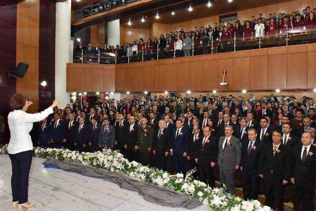 Vali Erdal Ata’nın, “Bütün Türk Milleti ile tek yürek olarak, ülkemizi felaketin kıyısından aydınlık bir geleceğe kavuşturan siz Büyük Önderimizi, kalplerimizde bir hatıra olarak değil, ideallerimize yön veren bir rehber olarak görüyoruz” mesajını yazdığı Anıt Şeref Defteri’ni imzaladığı Anıt’taki törenin ardından, Anma Programı Kültür Merkezi’nde devam etti.