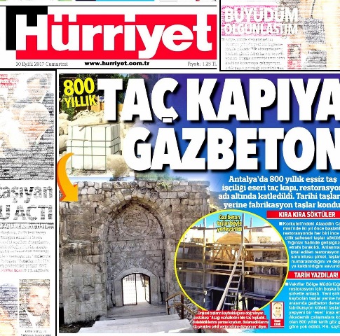 Hürriyet Gazetesi’nden Ömer Erbil’in son haberi, “Antalya Korkuteli’nde, Selçuklu Beylikler dönemine ait yaklaşık 800 yıllık Alaaddin Cami restorasyonu sırasında, taş ustalığının eşsiz örneklerinden Taç Kapı harap edildi” diye başlamış, “Taç Kapı’nın yerine, fabrikasyon taşlarla bambaşka bir yapı kondu” diye devam etmiş. Ederken de, bize ‘BİZİ’ hatırlatmış !