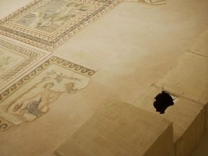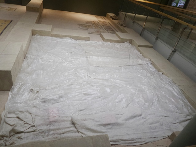 Müze’yi gezmeye gelenleri karşılayan ilginç görüntülerden biri, sergileme alanlarında ve duvarlara ekli bölgelerde üzerlerine ‘özenle’ örtüler serilmiş mozaikler oldu. Mozaik alanına getirilmiş ve yere monte edilmiş ya da duvara asılmış bir mozaik eserin tamamlanmış olması gerekmez mi? Peki, bu durum, tamamlanmamış kısma mı dair? Ya da tamamlanmış ama ‘eksik’ kalan kısma mı dair? Yoksa tespit edilen hata noktasında bir ‘zorunlu’ mola alımı mı? Hangisi?
