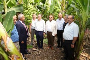 “Beyaz Altın” adıyla anılan pamuğun anavatanı ilimiz Hatay’ın Amik Ovası’nda muz üretimine başlanıyor. Bir kuruluş adına oluşturulan modern tarım yöntemiyle, Amik Ovası’nda oldukça yüksek verimde muz elde edildi. Hafta içinde, aralarında Hatay BŞB Başkanı Lütfü Savaş ile Reyhanlı Ticaret ve Sanayi Odası Başkanı Necmettin Zaroğlu’nun da bulunduğu bir heyet, muz üretimi yapılan seraları gezdi. Yüksek verimde gerçekleşen muz ekili alanlar hayran bıraktırdı ve önümüzdeki süreçte muz üretiminin Amik Ovası’nda yaygınlaşabileceği ifade edildi. Muz serasını gezen BŞB Başkanı Lütfü Savaş, kısa mesajında, “Ovamızın verimli topraklarında modern tarımsal faaliyetleri ile yapılan meyve yetiştiriciliği ile ilgili incelemelerde bulundum” dedi. -Gökay Gökdemir-