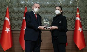 Antakya Medeniyetler Korosu adına, Kültür ve Turizm Bakanlığı 2019-2020 Özel Ödülü’nü Cumhurbaşkanı Recep Tayyip Erdoğan’ın elinden alan Berna Özfırat, anlamlı ödülü, Cumhurbaşkanı Erdoğan’ın elinden almanın mutluluğunu yaşadığını söyledi. -Cemil Yıldız-
