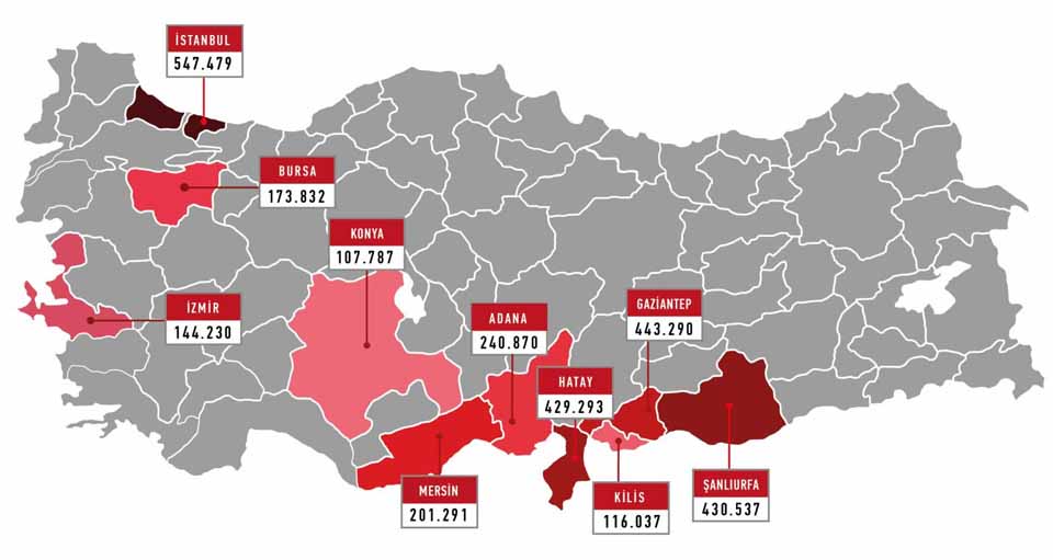 İstanbul: 547 bin 479, Gaziantep: 443 bin 290, Şanlıurfa: 430 bin 537, Hatay: 429 bin 293, Adana: 240 bin 870, Mersin: 201 bin 291, Bursa: 173 bin 832, İzmir: 144 bin 230, Kilis: 116 bin 37, Konya: 107 bin 787, Ankara: 92 bin 670, Kahramanmaraş: 89 bin 553, Mardin: 87 bin 217, Kayseri: 78 bin 531, Kocaeli: 57 bin 337,