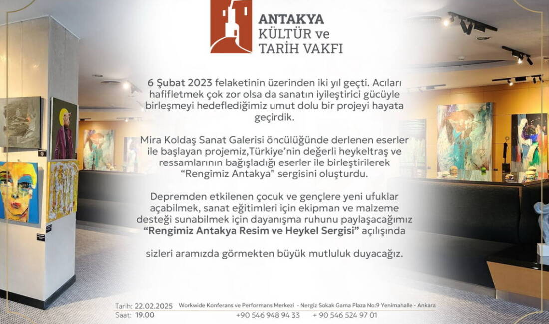 6 Şubat 2023 depreminin ikinci yılında, sanatın iyileştirici gücünü vurgulayan anlamlı bir proje hayata geçiriliyor. Antakya Kültür ve Tarih Vakfı’nın öncülüğünde, Mira Koldaş Sanat Galerisi iş birliğiyle hazırlanan “Rengimiz Antakya” Resim ve Heykel Sergisi, sanatseverleri dayanışmaya davet ediyor.