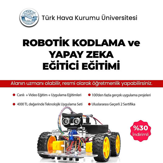 Türk Hava Kurumu Üniversitesi, öğretmenler için yeni ve heyecan verici bir eğitim fırsatı sunuyor. 81 ildeki tüm öğretmenlerin katılımına açık olan Robotik Kodlama ve Yapay Zeka Eğitici Eğitimi ile okullarınızda teknoloji atölyeleri kurabilir, resmi olarak sertifikalı eğitici olabilirsiniz.