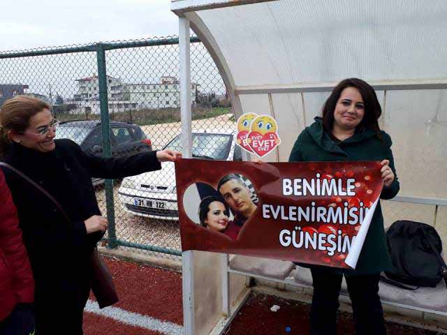 Antakyalı Futbol Hakemi Sinan Başak, yöneteceği maç öncesinde saha kenarındaki sevgilisinin yanına kadar, elinde “Benimle evlenir misin?” yazısı olan bir dövizle geldi ve sevgilisine ‘İLAN-I AŞK’ etti.