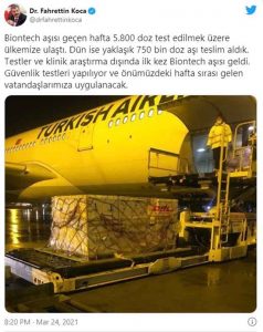 Twitter hesabından açıklama yapan Koca, geçen hafta BioNTech aşısından 5 bin 800 dozu test edilmek üzere teslim aldıklarını belirterek, “Dün (23 Mart) ise yaklaşık 750 bin doz aşı teslim aldık. Testler ve klinik araştırma dışında ilk kez BioNTech aşısı geldi. Güvenlik testleri yapılıyor ve önümüzdeki hafta sırası gelen vatandaşlarımıza uygulanacak” dedi.