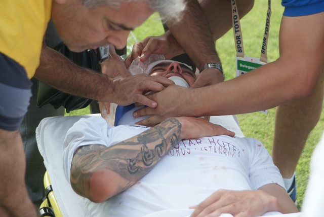 -Hatayspor’un santrforu Taha, Kastamonu maçı ilk yarısında rakibiyle girdiği hava mücadelesi sırasında kafa kafaya çarpıştı, kanlar içinde yerde kaldı, ambulansla hastaneye kaldırıldı, kafası sargıya alındı ve MR’ı çekildi. Kırık ya da çatlak yok, ancak kanama olasılığına karşı tedavi sürecek.