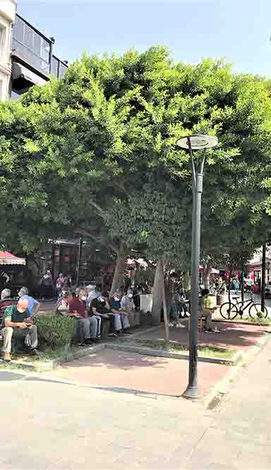 T.B. >> Her gün buradan geçiyorum, öğlenleri. Kimi çarşıdan, alışverişten dönmüş, kimi yorulmuş, kimi terlemiş, kimi maskenin de verdiği nefessizlikle mola almak istemiş. Ama baktığında, oturacak yer bulamamış. Şimdilerde bu süs havuzu da olmasa, yer yok, çökecek! Bu kentin en güzel alanı burası, ama vatandaşın kullanımında değil!