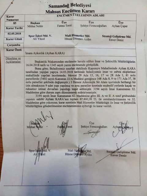 Şirket ortağı İşadamı Ayhan Kara tarafından yapılan kaçak ve ruhsatsız yapılarla ilgili Ayhan Kara’nın avukatı ve şahsından istenen bilgi ve belgeler tarafımızca defalarca istenmesine rağmen ulaştırılmamıştır. Konu ile ilgili istenen hiçbir belge tarafımıza sunulmamıştır. Bunun üzerine Belediyemiz Encümeni toplanmış ve aşağıda yazılan kararı oybirliği ile almıştır.