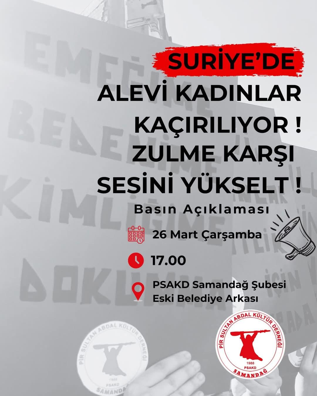 Etkinlik duyurusunda yer alan afişte, “Suriye’de Alevi Kadınlar Kaçırılıyor! Zulme Karşı Sesini Yükselt!” ifadeleri öne çıkıyor. Samandağ’daki etkinliğe sivil toplum kuruluşları, insan hakları savunucuları ve duyarlı vatandaşların katılım göstermesi bekleniyor.