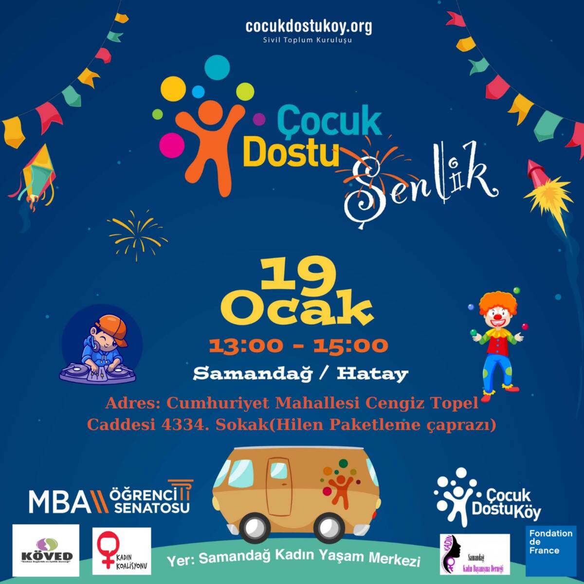 Samandağ Kadın Yaşam merkezi ve sivil toplum kuruluşu cocukdostlukkoy.org işbirliğiyle bugün 13:00 ile 15:00 saatleri arasında Samandağ’da Çocuk dostluk şenliği düzenleniyor. Samandağ Kadın Yaşam Merkezi’nde 19 Ocak pazar günü saat 13.00-15.00 arasında Çocuk Dostu Köy Derneği işbirliğinde çocuklara şenlik düzenlenecek. -Dj ve palyaço eşliğinde çeşitli oyunlar -İkramlar ve sınırsız eğlencenin olacağı etkinliğe tüm çocuklar ve aileleri davet edildi. Etkinlik Cumhuriyet caddesi Cengiz topel caddesi 4334. Sokakta gerçekleşecek.