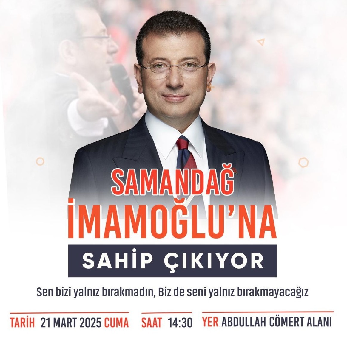 Samandağ halkının, İmamoğlu’na verdiği desteği göstermek için düzenlenecek olan etkinlik, 21 Mart 2025 Cuma günü saat 14.30’da Abdullah Cömert Alanı’nda gerçekleştirilecek.