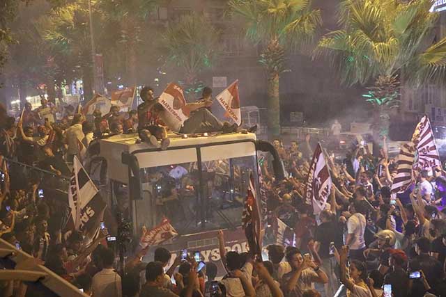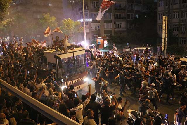 Türkiye 1. Ligi’nde şampiyon olan Hatayspor’da kutlamalar sürüyor. Pazar günkü maç bitiminde, Hatayspor futbolcuları ile eşleri ve çocuklarını taşıyan açık otobüs, stadyum içinde ve şehirde tur attı. Bu arada maç bitimi, Pazar akşamı, Antakya ve Defne sokaklarında şampiyonluk turu atan binlerce taraftar, şampiyonluk sevincini doyasıya yaşadı.