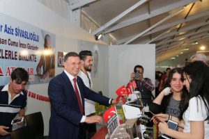 Hatay Büyükşehir Belediyesi’nin bu yıl 2.si gerçekleştirdiği ‘Kitap Fuarı’nda ziyaretçi sirkülasyonu artarak sürüyor. Fuarı dört günde on binlerce kişinin ziyaret ettiği belirtildi. BŞB Başkanı Lütfü Savaş, açılışını Cuma günü yaptığı Fuar’ın açılış günü, Pazar ve Pazartesi günleri olmak üzere üç kez ziyaret etti. Savaş, ziyaretleri sırasında, kitapçı stantları ve yazar stantlarını ziyaret etti, konuklarla, okurlarla, […]