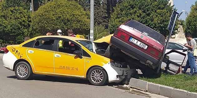 Antakya’da, dün sabah kent merkezindeki kazada, bir otomobil, çarptığı bir başka otomobilin üzerine çıktı. İlginç kaza, Vali Ürgen Alanı’nda yaşandı. Güvenilir bir kaynağa göre, Vali Ürgen Alanı’ndan Atatürk Caddesi yönüne giden, sürücüsü belirlenemeyen 31 T 0264 plakalı Fiat Linea marka taksi, Fatih Caddesi yönünden gelen, sürücüsünün ismi öğrenilemeyen Tofaş Doğan marka 31 K 8396 plakalı otomobilin yan tarafına çarptı. Çarpmanın etkisi ile diğer araç, taksinin kaputunun üzerine çıktı. Kısa bir mesafe sürüklenen araçlar, refüje çarparak durabildi. İlginç kaz,a ucuz atlatıldı. Ölü ya da yaralının olmadığı kaza nedeniyle, motorlu taşıt trafiği kısa bir süre aksadı. Kazaya karışan araçlar çekildikten sonra, trafik normal seyrine girdi. -Cemil Yıldız-