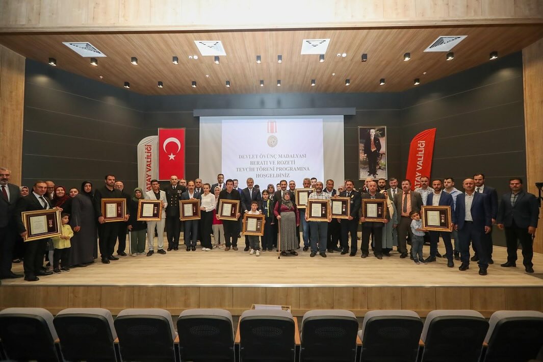 Hatay Valiliği’nin organizasyonunda düzenlenen Devlet Övünç Madalyası Beratı ve Rozeti Tevcih Töreni, Hatay Valisi Mustafa Masatlı, İl Garnizon Komutanı Tuğgeneral Ali Mete, Hatay Büyükşehir Belediye Başkanı Mehmet Öntürk, il ve ilçe protokol üyeleri, şehit aileleri ve gazilerin katılımıyla gerçekleşti.