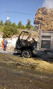 Mersin’in Gülnar ilçesinde saman yüklü Hatay plakalı kamyon, çıkan yangında kullanılamaz hale geldi.