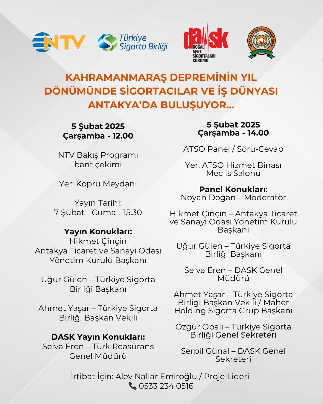 Antakya Ticaret ve Sanayi Odası’nda (ATSO), NTV ve Sigortacılar Komitesi tarafından organize edilen sigorta sektörü buluşması gerçekleşti. ATSO Başkanı Hikmet Çinçin’in ev sahipliğinde düzenlenen toplantıya, sigorta sektörünün önde gelen temsilcileri, acente sahipleri ve Doğal Afet Sigortaları Kurumu (DASK) Müdür Yardımcısı katıldı.