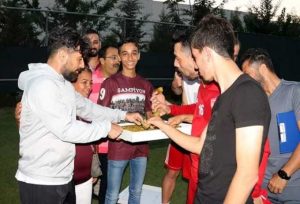 Hatayspor Asi Taraftar Grubu Derneği kurucusu Songül Taşdelen, Bordo-Beyazlı ekibin önceki gün 24 yaşını tamamlayan golcüsü Sinan Kurumuş’a “Doğum Günü” sürprizinde bulundu. Elinde bir tepsi baklava ile Hatayspor’un idman alanına gelen fanatik taraftar Songül Taşdelen, Sinan’a “nice mutlu yıllar “dileğinde bulundu ve tepsi içindeki baklavayı idmanı tamamlayan futbolculara ikram etti. Elindeki bir buket çeciği, 2 Ağustos günü 24 yaşını tamamlayan Sinan’a verip “nice mutlu yıllar “ dileyen Songül, bu tür sürprizleri daha önce de birkaç kez yapmıştı. -Cemil Yıldız-